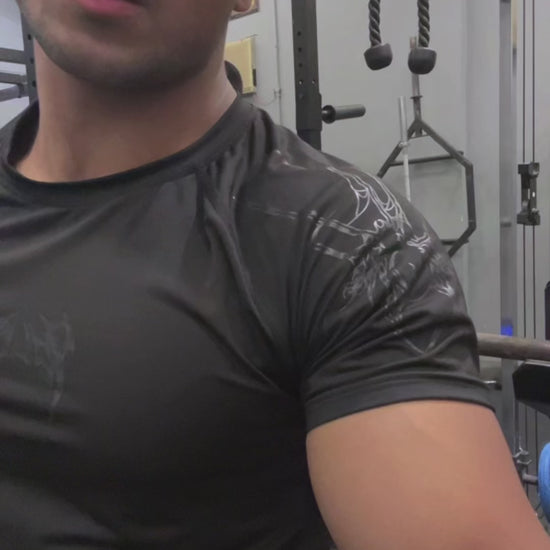 DESIGN: The Compression is built for performance and style, crafted with the same fit and premium fabric as . Featuring an eye-catching tribal pattern sides and on the shoulders and a bold high-density logo on the chest, this tee provides a sleek, athletic look. The pattern on the compression tee is designed to accentuate your shoulders and create a slimmer-looking waist, enhancing that V-shaped physique.